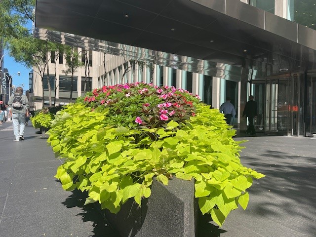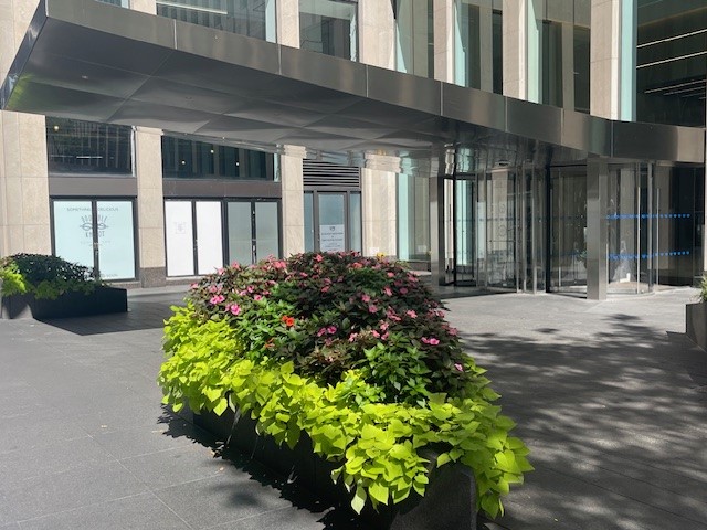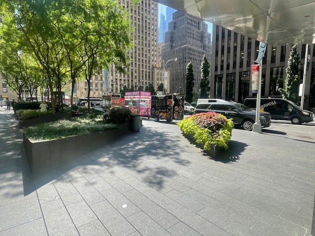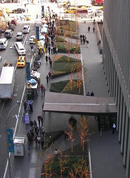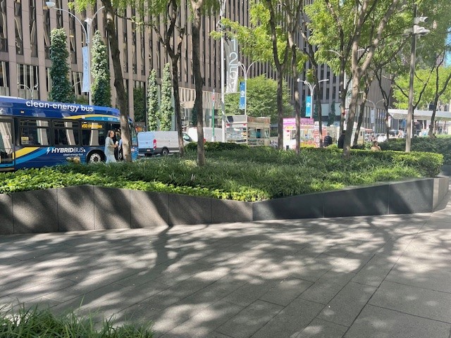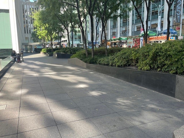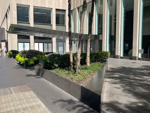 A new design was developed that introduced a connecting walkway from Avenue of the Americas to the north and south of the building. Trapezoidal planters with three-dimensional profile with diagonal walkways between them were incorporated. The planters were clad with granite and wider portions with polished granite to introduce discreet seating. The three-dimensional profile of the planters was accentuated with different vegetation and trees that provide comfortable shade for lunch time users and congregating area for holiday visitors.