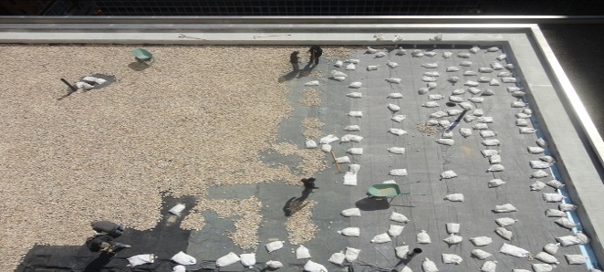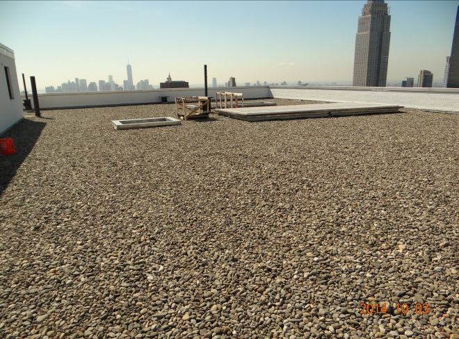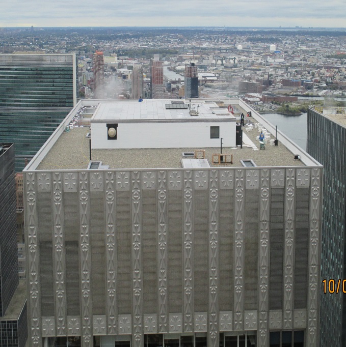 There are roofs at the 4th, 9th, 14th, 15th, 42nd 43rd, tank room, 45th (main) and penthouse roofs. Leaks had developed at the 14th and 15th floors. Diaz Architect & Associates, P.C. performed an extensive investigation of the roofs including conducting probes. Our investigation revealed a re-roofing membrane comprised of EPDM with stone ballast had failed. The roof underneath was a roof replacement performed in the past, which in turn, also failed. The roofs at the 14th and 15th floors were replaced immediately as they suffered the most. This failed condition of the EPDM membrane prompted the replacement of all the remaining roofs.