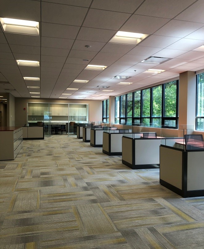 The office space was designed to accommodate training rooms, conference room, cubicle areas, drawing storage, estimating department, pantry area, visitor offices and executive office. The Executive Office included private bathroom, storage, and small conference room.