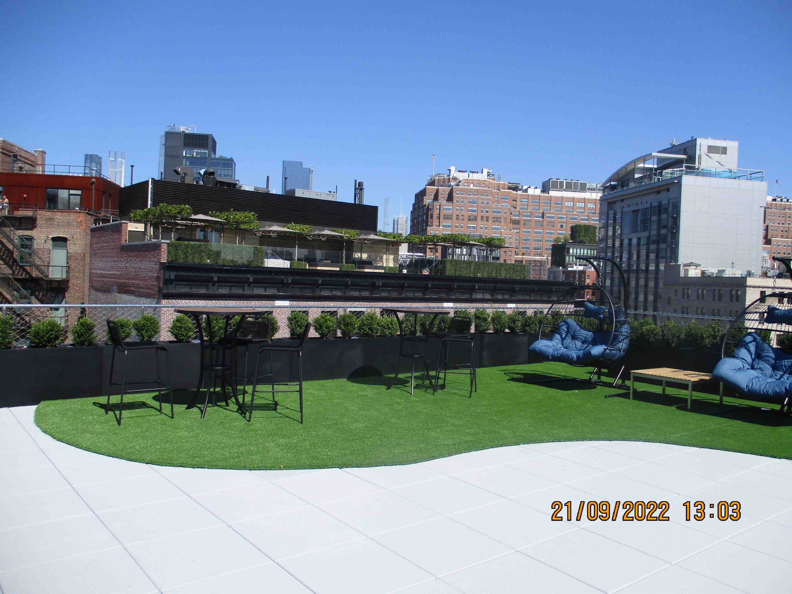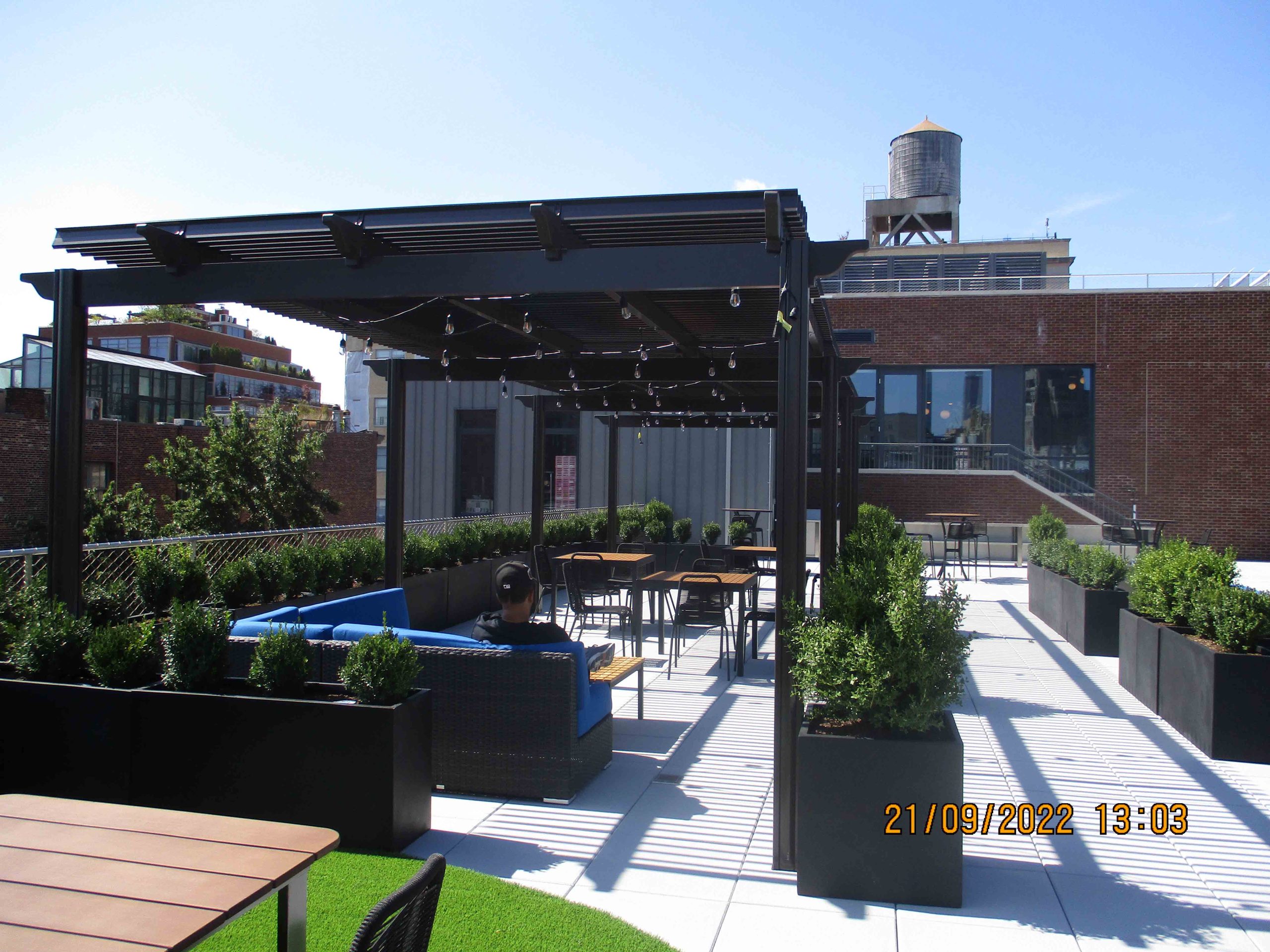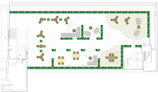 6th Floor Roof Terrace Renovation The existing office building was renovated with a 6th floor terrace with pavers only and perimeter guardrail. The entrance to the roof terrace was from the east side of the office. The existing blank office terrace had exit stair bulkhead at the southeast corner and access to elevator lobby and stairs at the south/west corner of the roof. The present tenant wanted to create a congregation area and outdoor workspace option.Diaz Architect & Associates, P.C. designed a roof terrace with the following features: