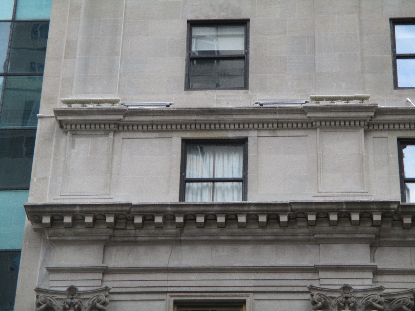 711 Fifth Avenue is an 18-story high steel framed structure constructed in 1927. The building consists of ornamental limestone panels on masonry backup from grade to the 14th floor. Bracketed limestone cornices are located at the 4th and 14th floors. There are Corinthian columns with terra cotta capitals pilasters from the 2nd to the 4th floor. The two-story north penthouse consists of multi-wythe brick walls laid in a running bond with heads and decorative terra cotta pilasters with capitals and horizontally with decorative terra cotta bands.