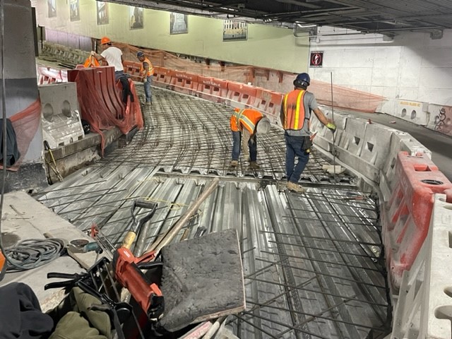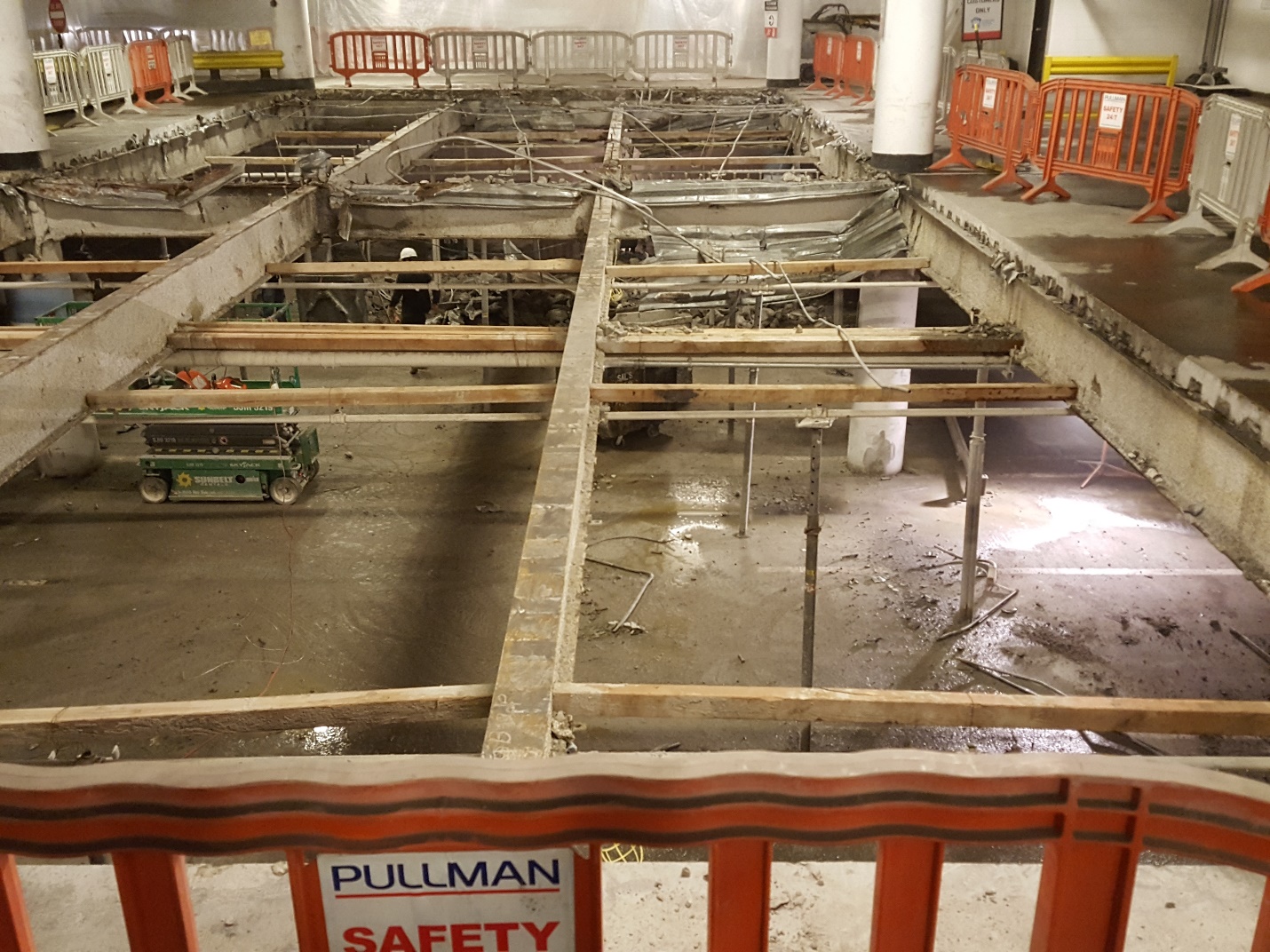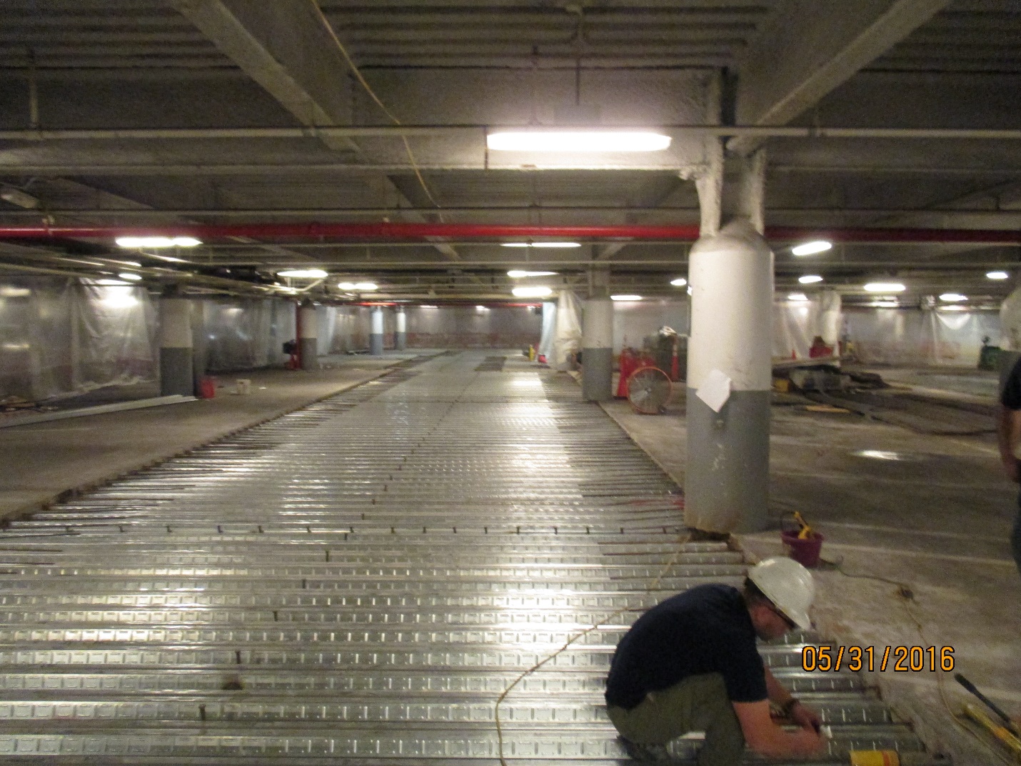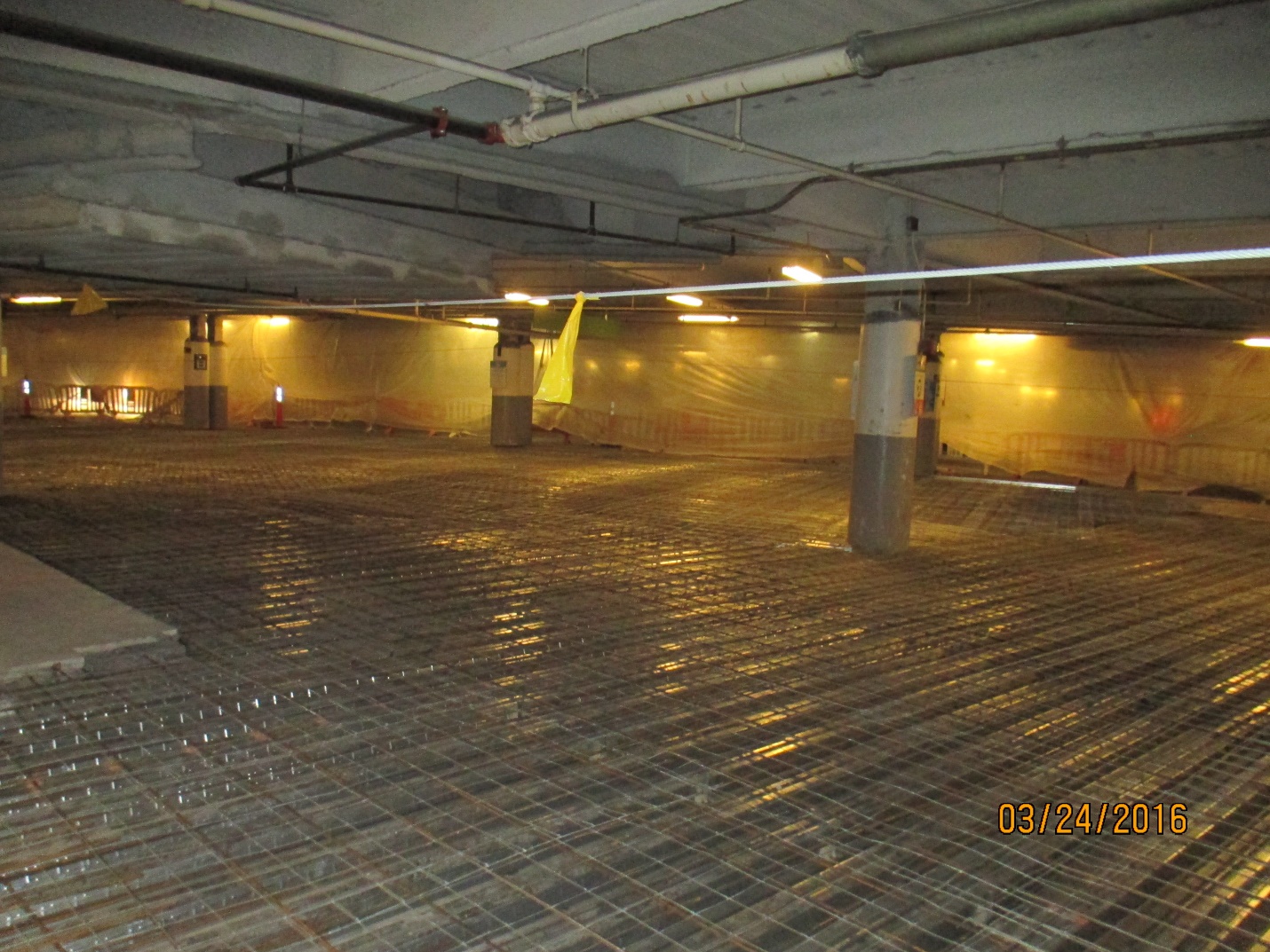 625 Atlantic Avenue parking garage is located in downtown Brooklyn. The parking garage serves major retail and shopping centers, located with the 3-story high complex. The parking garage structure consists of concrete on metal deck on steel beams. Testing and probing revealed that original construction did not properly consolidate concrete and pour concrete during cold temperatures, subjecting to lack of proper curing. Lack of proper waterproofing membrane and roadway salts subjected the metal deck and steel to corrosion.