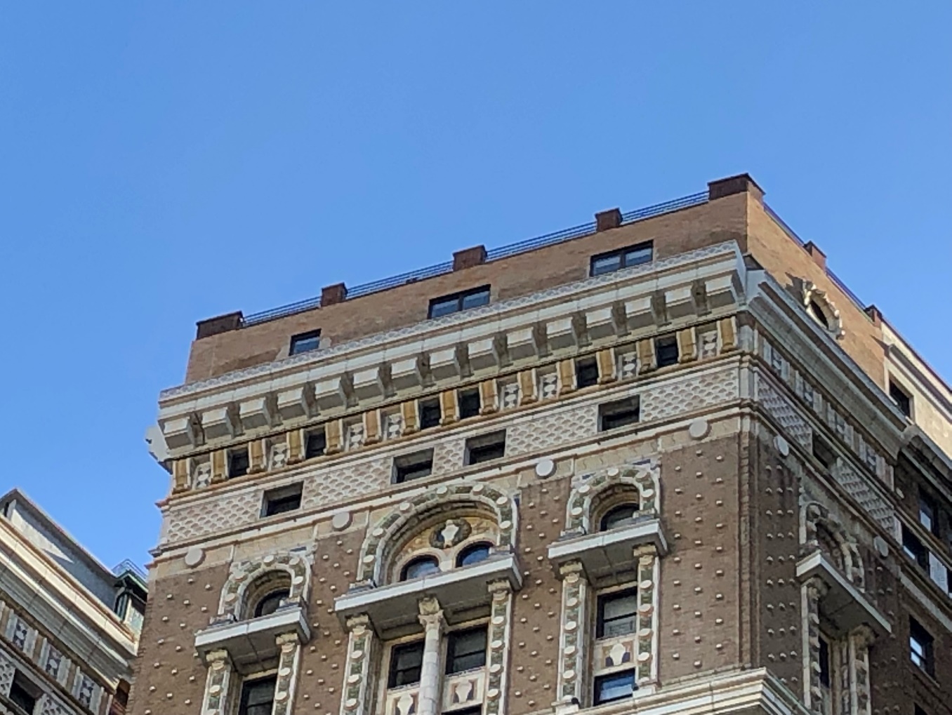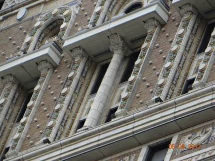 The building facade consists of limestone on brick backup from grade to x floor with balconies and balustrades. The facade from x to x floor consist of brick laid in an ornamental pattern. The facade from x floor to the top of the main roof consists of recessed portions with terra cotta columns and glazed terra cotta units with colored figurines. The top of the parapet consists of cornice with terra cotta brackets.