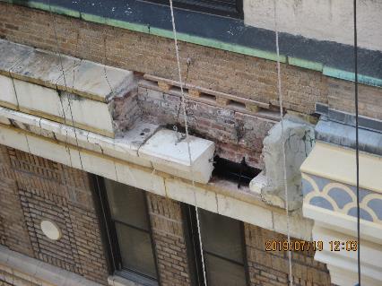 The building exhibited extensive cracking at terra cotta units at top colonnade, window surrounds, window sills and horizontal bands within the voids of the E configuration. Vertical cracking at brick building corners and deteriorated brick at window lintels existed through the facade.