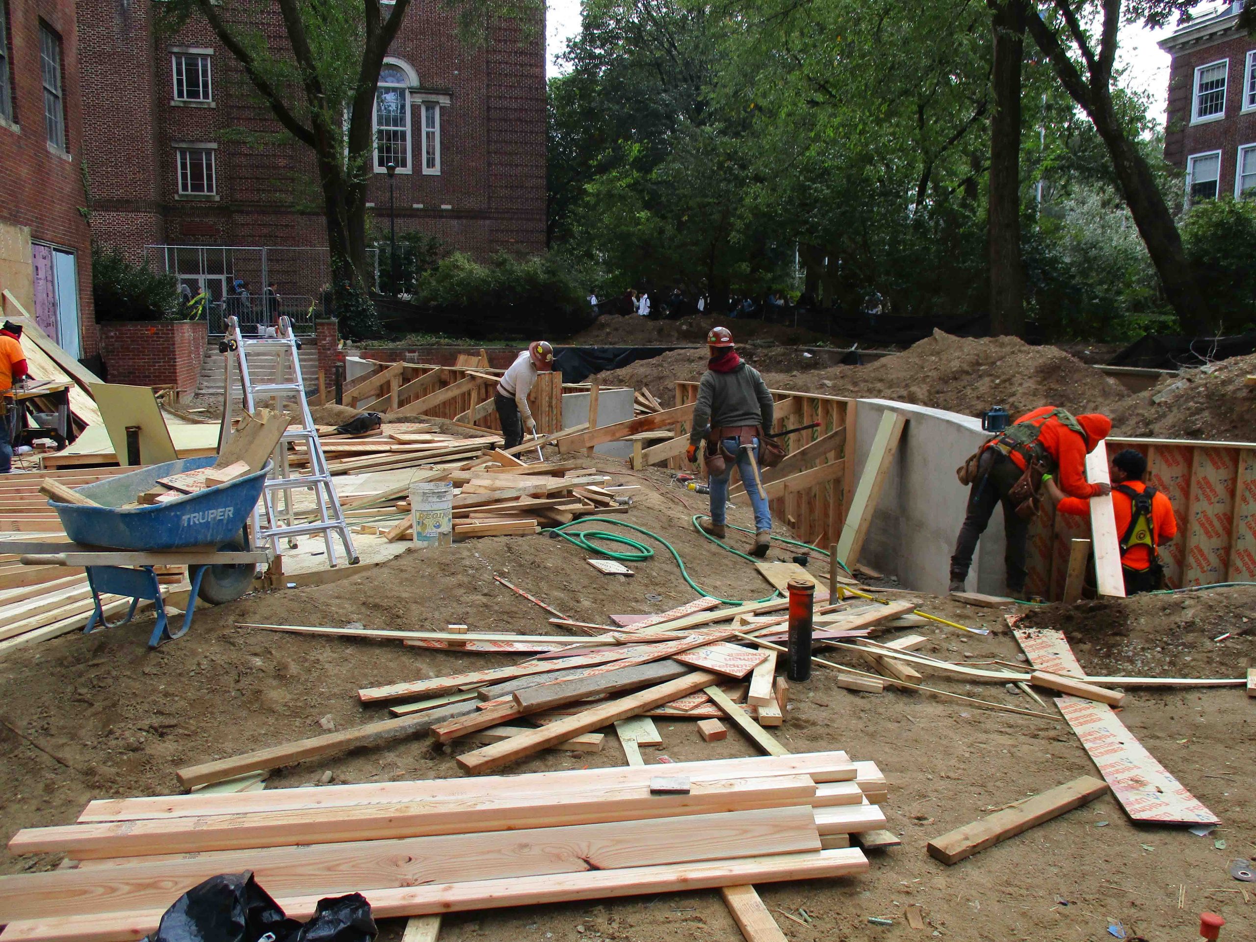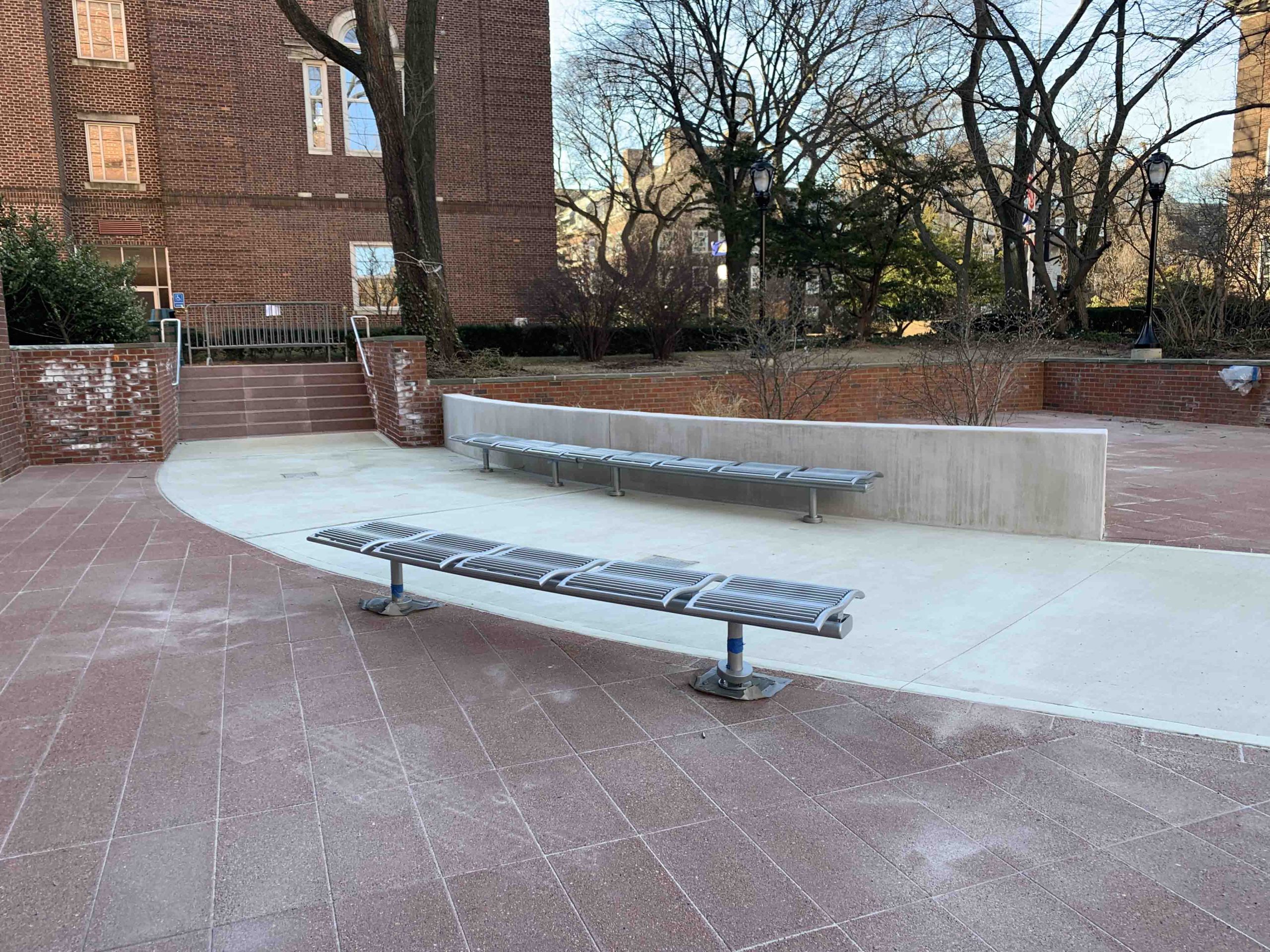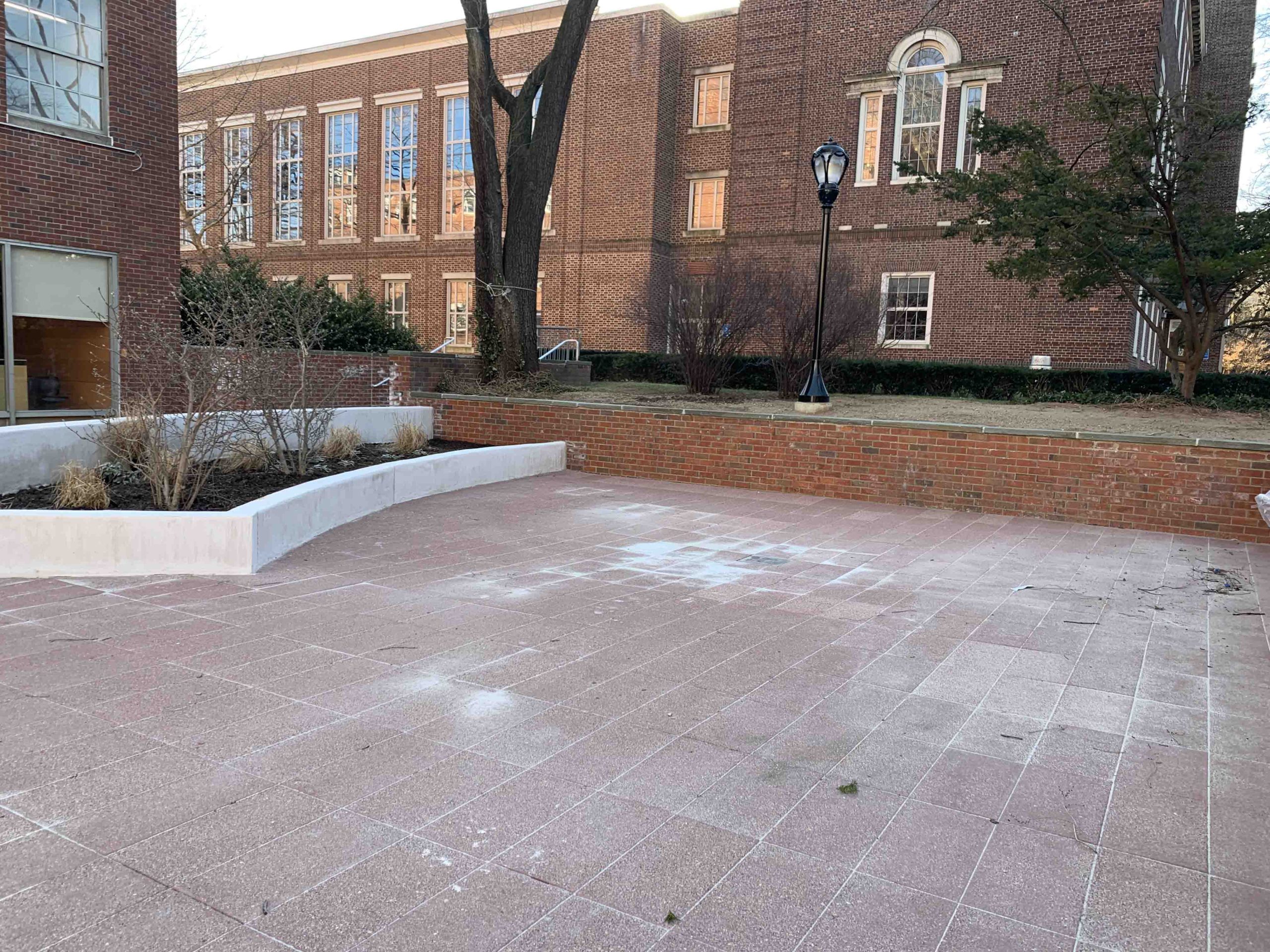 The disrepair of the plaza provided an opportunity to redesign the plaza to meet its full potential. A curvilinear path was introduced from the main stairs to the entrance of the library. The curvilinear path divided the plaza into two areas for congregation and socialization, with an area for studying and reading. Planter walls were designed at perimeter with curvilinear path seating within areas. The new design consisted of decorative concrete pavement sloped to plaza and low drains. Landscape included low planters and preservation of existing trees for shade.