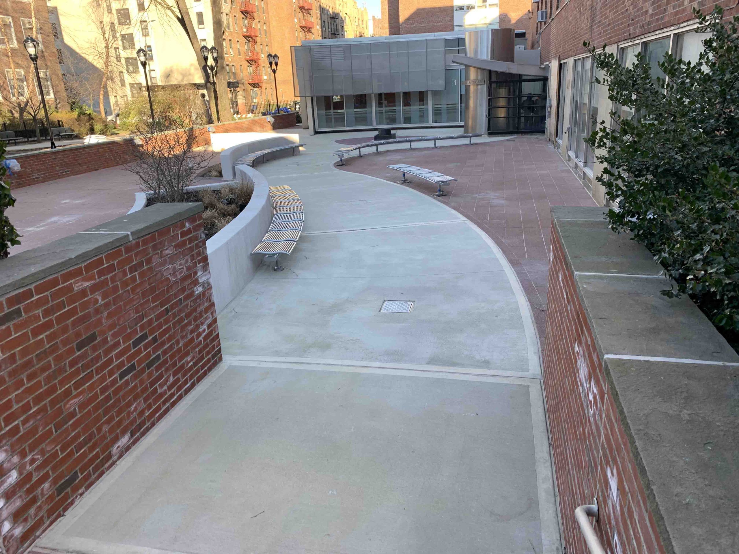 The Library Café Plaza at Brooklyn College is a sunken plaza on the west side of the building that was constructed in the 1970’s. It was renovated slightly in 2004, when an addition was constructed at the north side of the plaza and a new entrance was constructed at the northerly side of the west elevation.