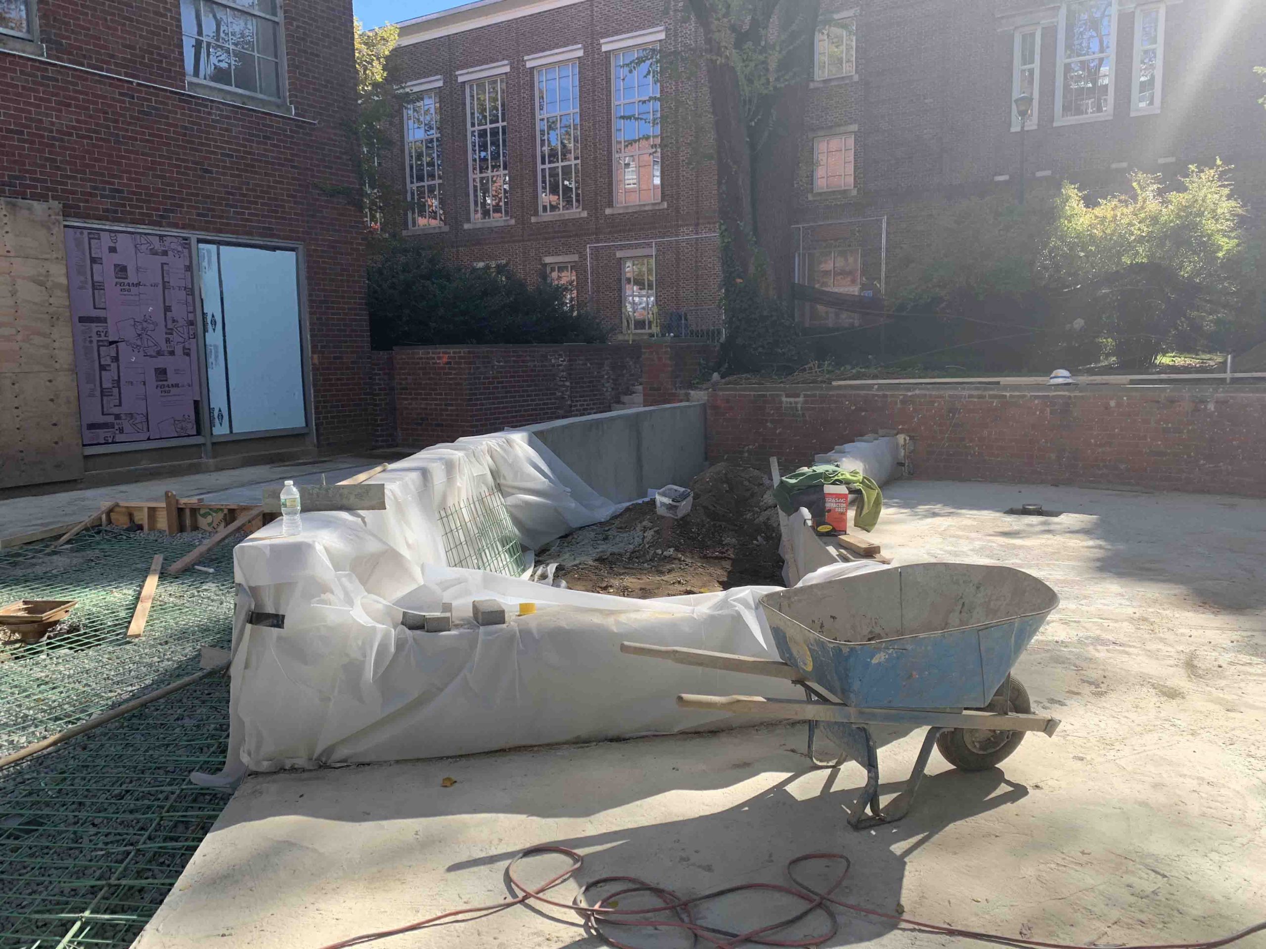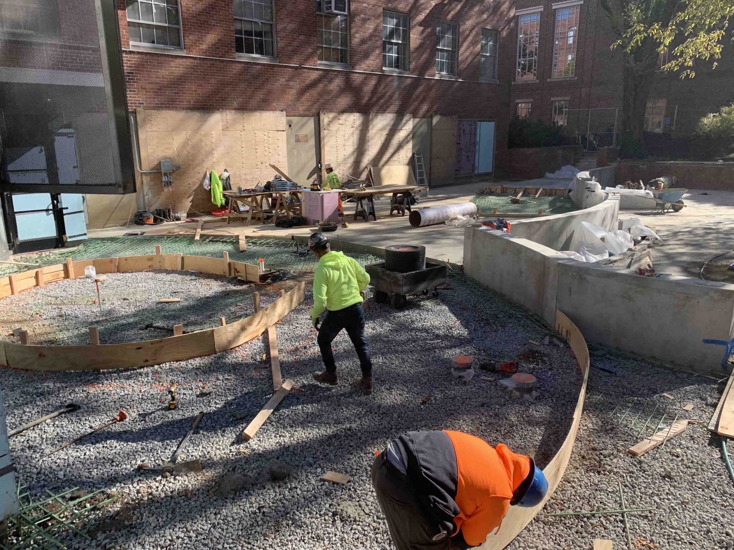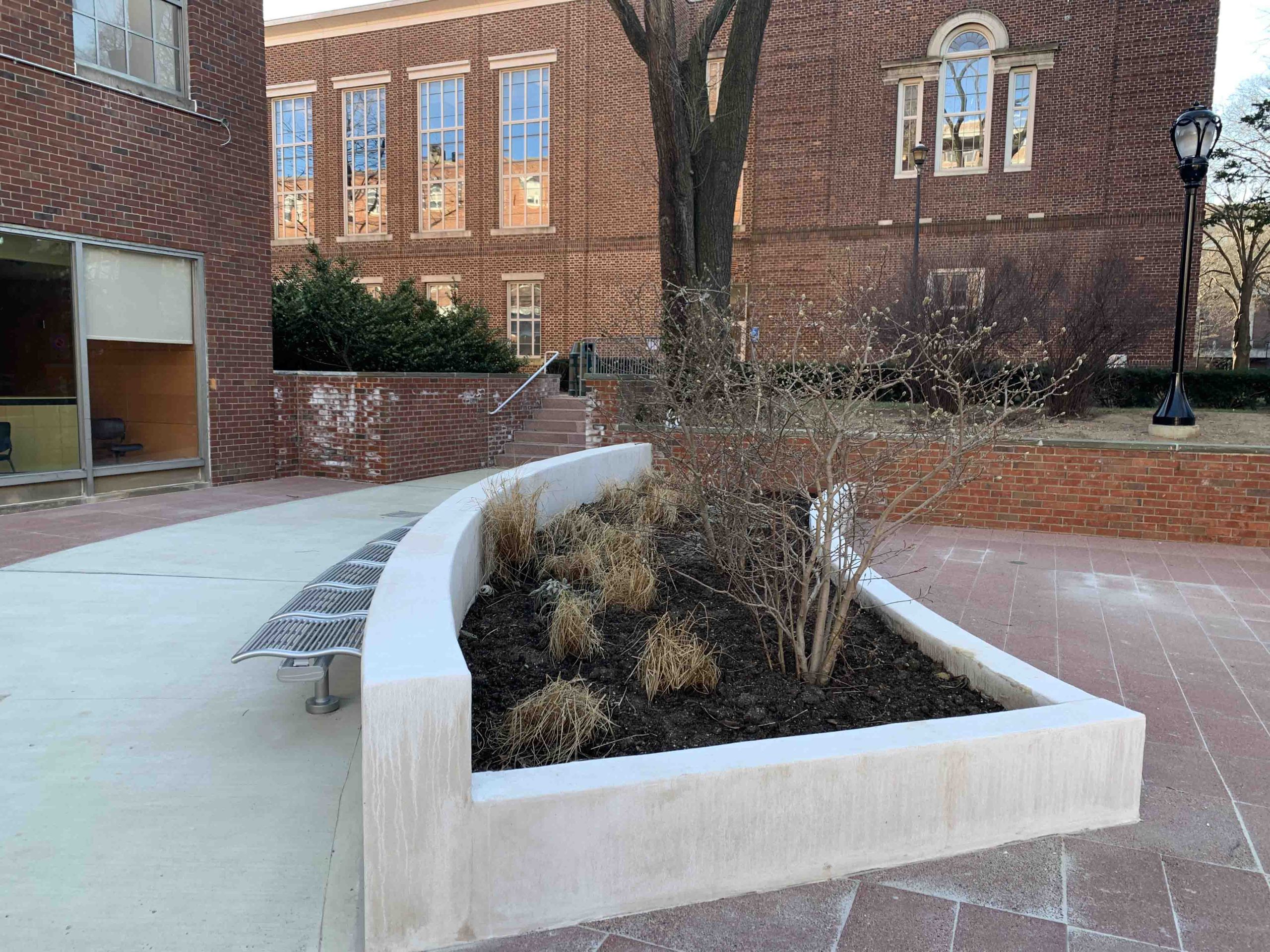 The plaza is entered by the stairs on the south side from the main throughfare and walkway ramp on the north side of around the addition. There are brick clad retaining walls on the east side of the plaza, which separates a landscaped area of trees and shrubs that provide necessary shade.
