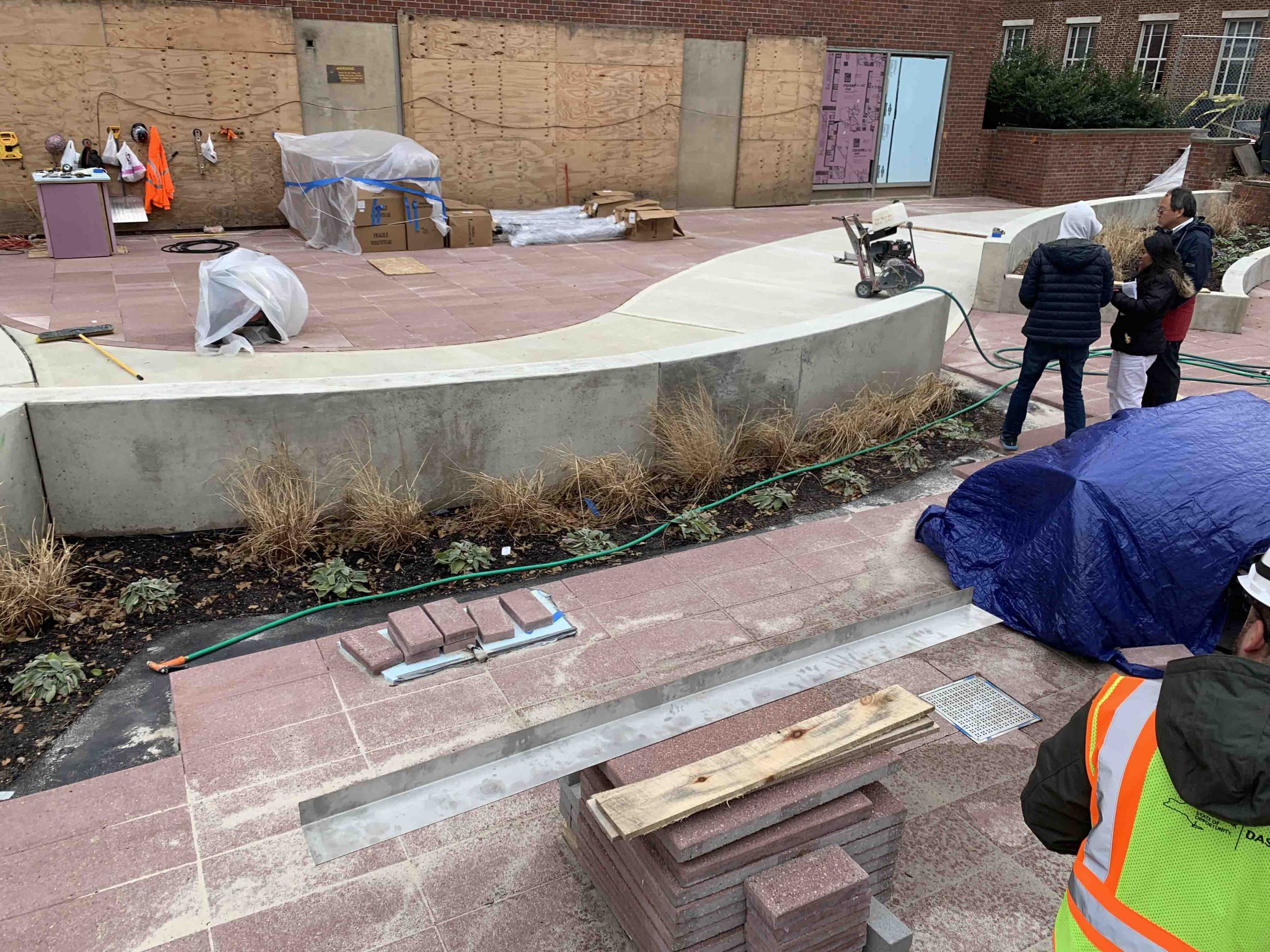 The plaza consisted of a brick paver system with bluestone grid on mud bed on concrete subbase. There were three plaza drains that provided drainage at the plaza level but trapped water at the concrete subbase. Negative drainage was evident at the vestibule entrance at the northeast corner of the plaza. Large areas of displaced and loose pavers existed from freeze/thaw cycles, due to trapped water from the lack of bi-level drainage.
