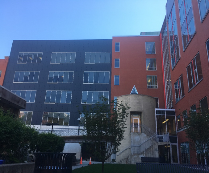Weston Hall is a 6-story high building that functions as the School of Architecture, Interior Design and Industrial Arts. The building consists of the north portion which was recladded over the original structure and the large addition on the south side, which was constructed in 1997. The building consists of aluminum frame curtain wall with glass spandrel and vision panels. There are aluminum panels cladding the parapets and columns. The base of the building, west façade, south and north end of the building consists of brick and concrete masonry unit (CMU) cavity wall construction.